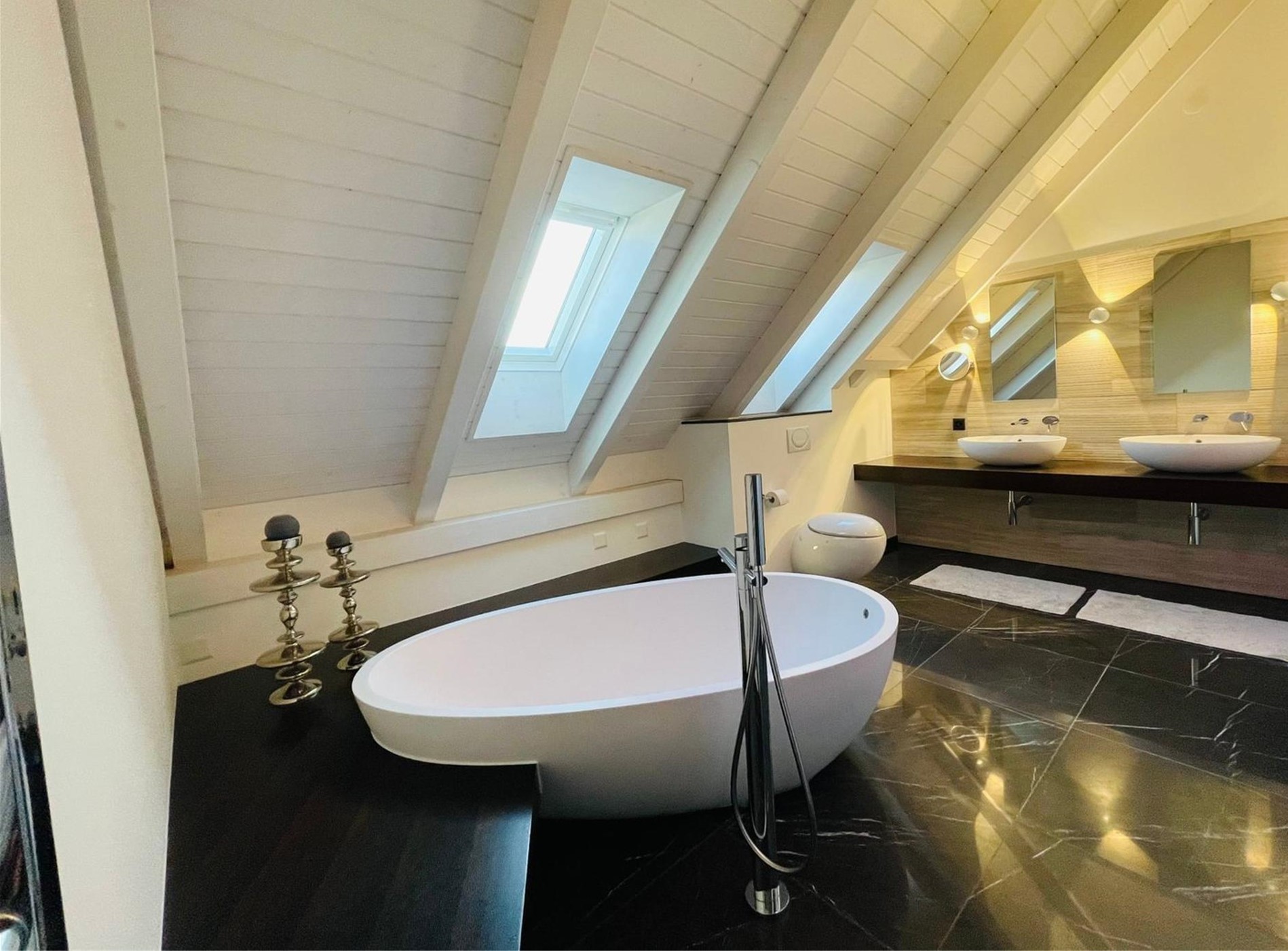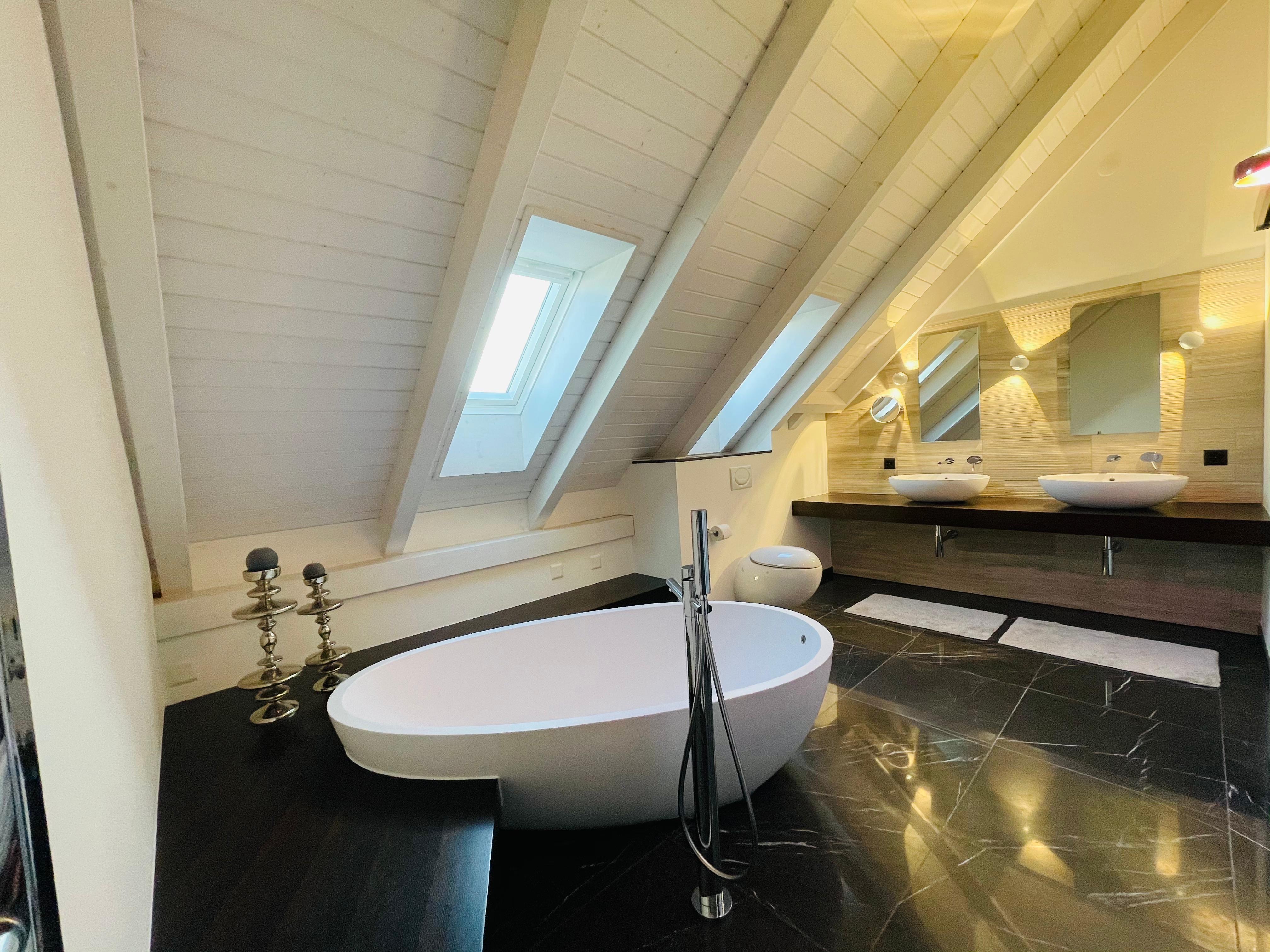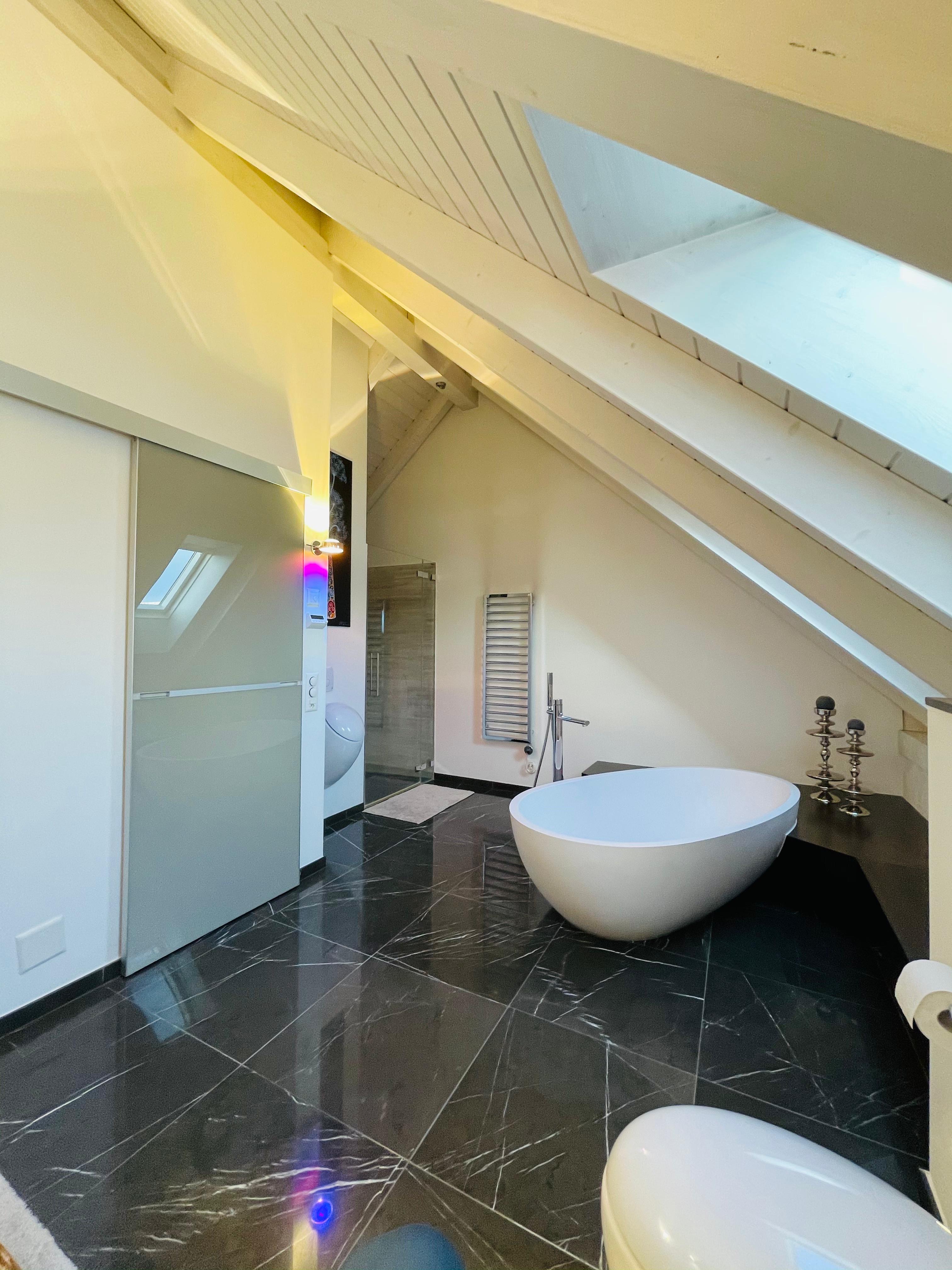 Die Badezimmer im Feldblick Refugium sind wahre Wellnessoasen, gestaltet mit hochwertigen Materialien wie Marmor-Böden und Keramik an den Wänden. Der grosszügige Raum erlaubt eine harmonische Einrichtung mit einer freistehenden Badewanne und einer begehbaren Dusche, ergänzt durch elegante Aufsatzwaschbecken und stilvolle beheizbare Handtuchhalter. Jedes Element wurde sorgfältig ausgewählt, um Komfort mit stilvoller Ästhetik zu verbinden. Praktisch sind auch die eigene Waschmaschine und der Tumbler direkt in der Wohnung.