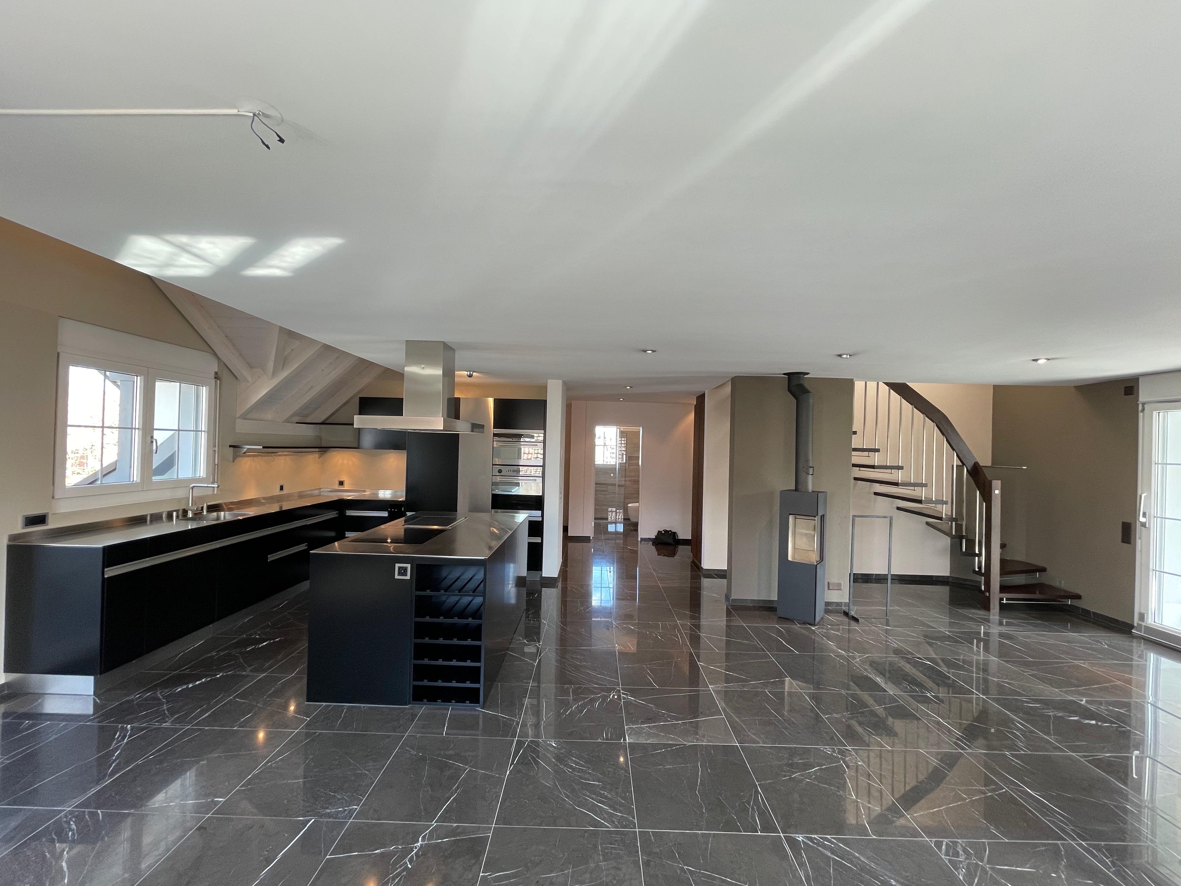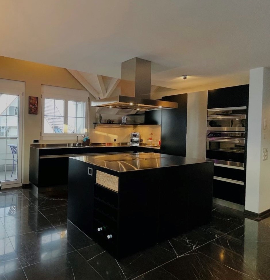 Hochwertige, designorientierte Küche mit Kompaktbackofen und integriertem Steamer, Induktionskochfeld, Mikrowelle sowie Geschirrspüler. Die grosszügige Kochinsel mit Teppanyaki und der Weinkühlschrank setzt ein besonderes Highlight und lädt zu genussvollen Momenten ein.
